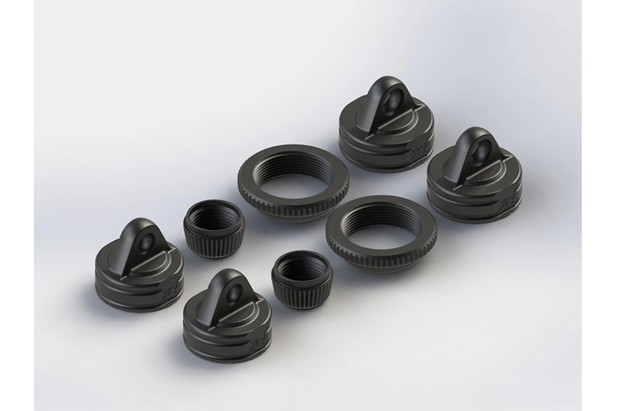 Super-tough composite material for long-lasting performance and increased crash resistance in all conditions – Precision manufactured to provide consistent fitting of shock caps and easy ride height adjustments with the included shock adjustment collars – High-quality shock cartridge closure caps for consistent sealing of assembly and easy removal for servicing