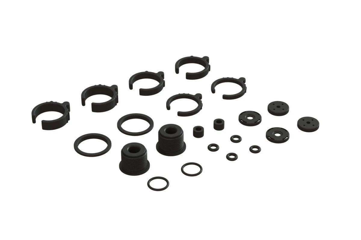 This composite shock part and O-ring set provides a collection of big bore shock absorber spare parts for your RC tool box.