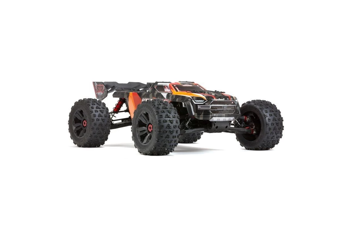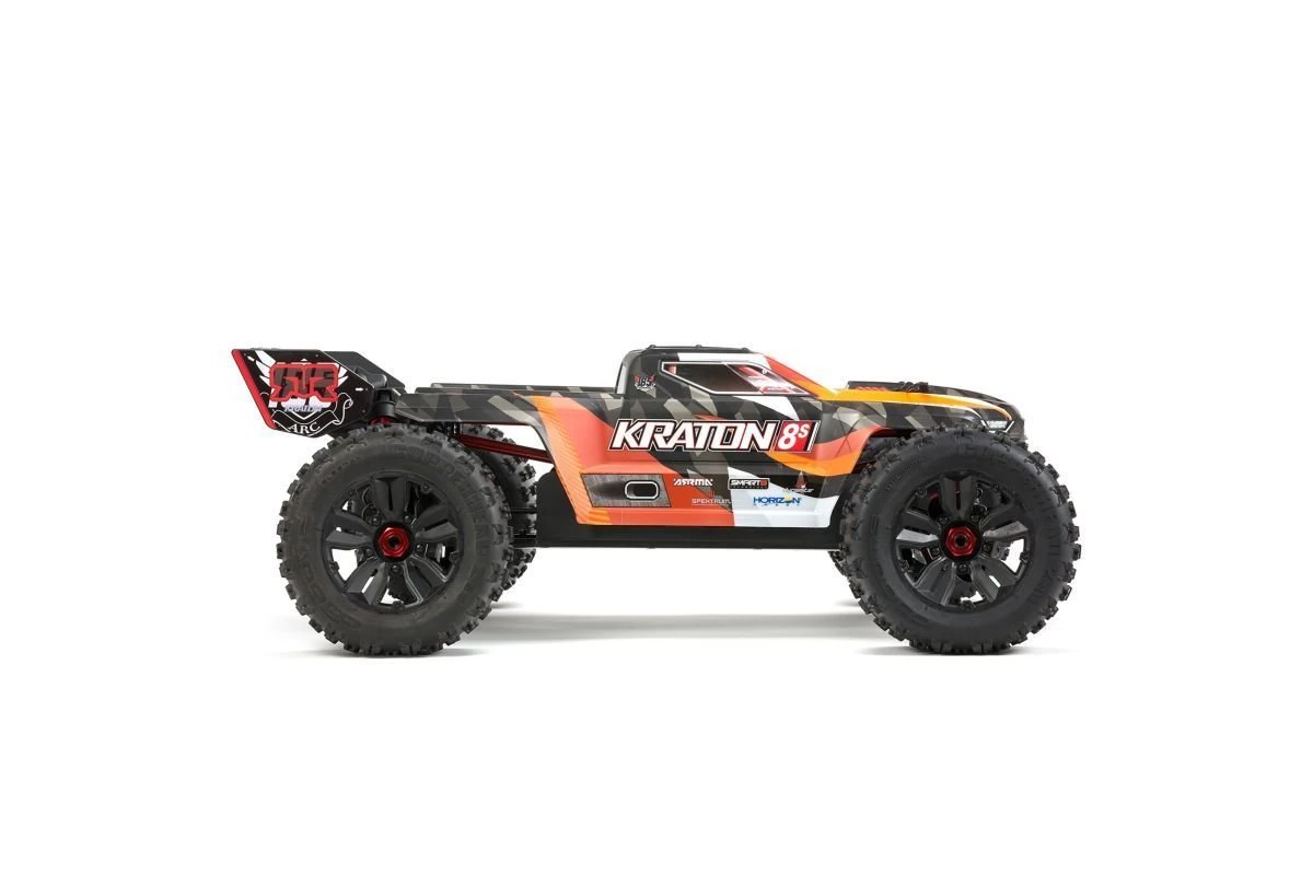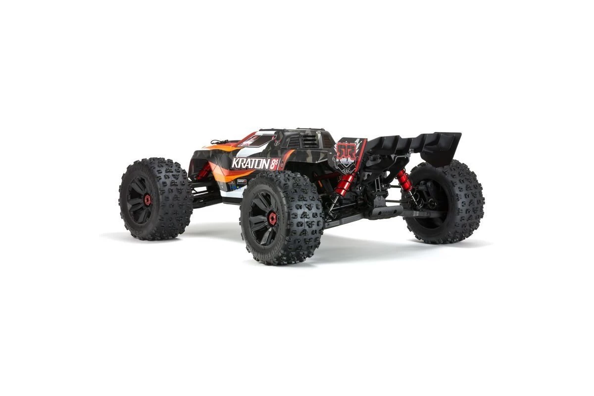 Bigger than big and engineered for brute power and toughness, the ARRMA® 1/5 scale KRATON™ 8S BLX 4WD Speed Monster Truck takes your bashing ability to the next level. Its metal-reinforced design lets you blast up, over, and through bruising obstacles without worry. Metal shafts, turnbuckles and outdrives, plus all-metal internal gears, give the drivetrain and suspension system unstoppable strength. The anodized aluminum chassis plate features composite side pods and a triangular center brace for maximum durability. Ultra-thick composite front and rear shock towers hold massive 20mm bore, oil-filled adjustable shocks that soak-up bumps and jolts.
