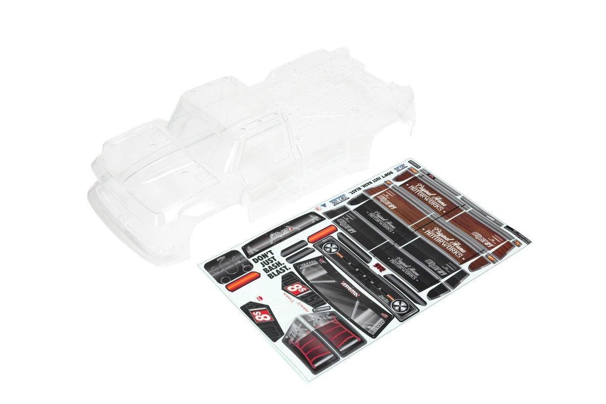 This is a clear unpainted 1/5th body shell for the 8S ARRMA Outcast. Stickers and Decals are included on a seperate decal sheet.