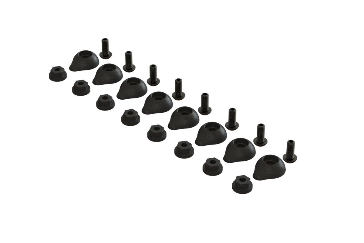 Precision molded composite body protector sits on the body surface, the protector nut sits on the underside. These parts are screwed together with the supplied M4 screws – Prevents wear to the bodyposts from upside-down sliding on hard surfaces – Supplied in a set of 8
