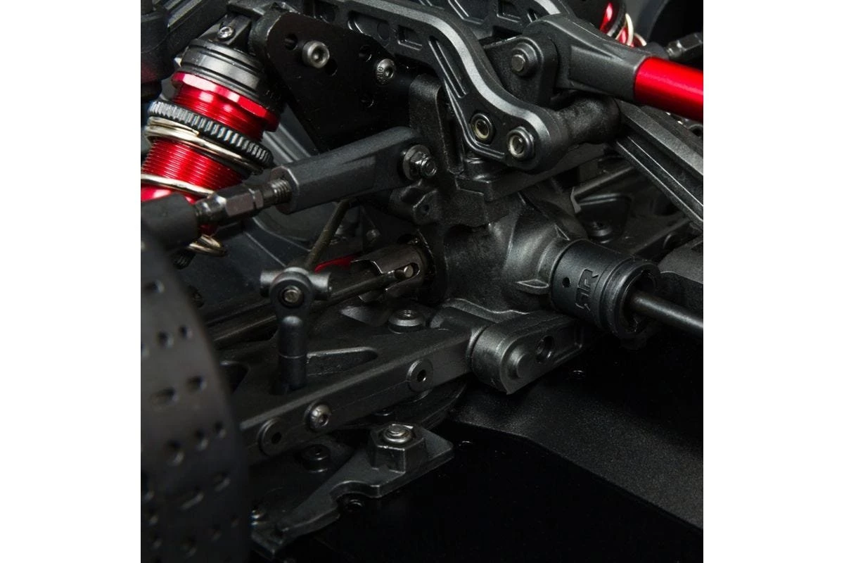 Underneath those streamlined Street Bash looks is a chassis which proves to the world, once again, that ARRMA® builds the most durable bashers. The 6061-T6 anodized aluminium chassis houses a heavy-duty drivetrain with steel driveshafts, plus all-metal diff outdrives and gearbox internals. Updated internal gears feature a new tooth profile for increased strength. A lower internal gear ratio reduces the centreline transmission RPM, reducing the centre driveshaft resonance and increasing drivetrain durability. Chassis toughness is reinforced with a centre brace. Bearings are rubber-shielded, and the adjustable, oil-filled, anodized aluminium shocks are mounted on strong, black-anodized aluminium shock towers.